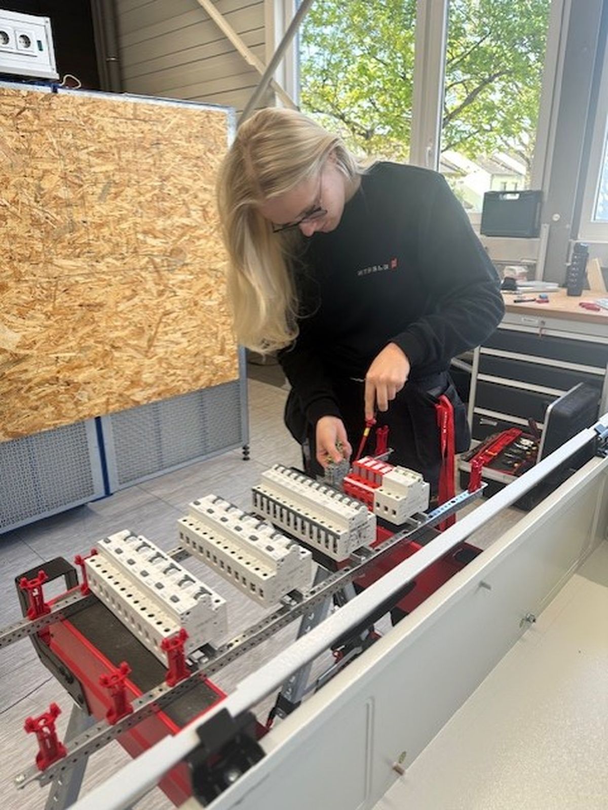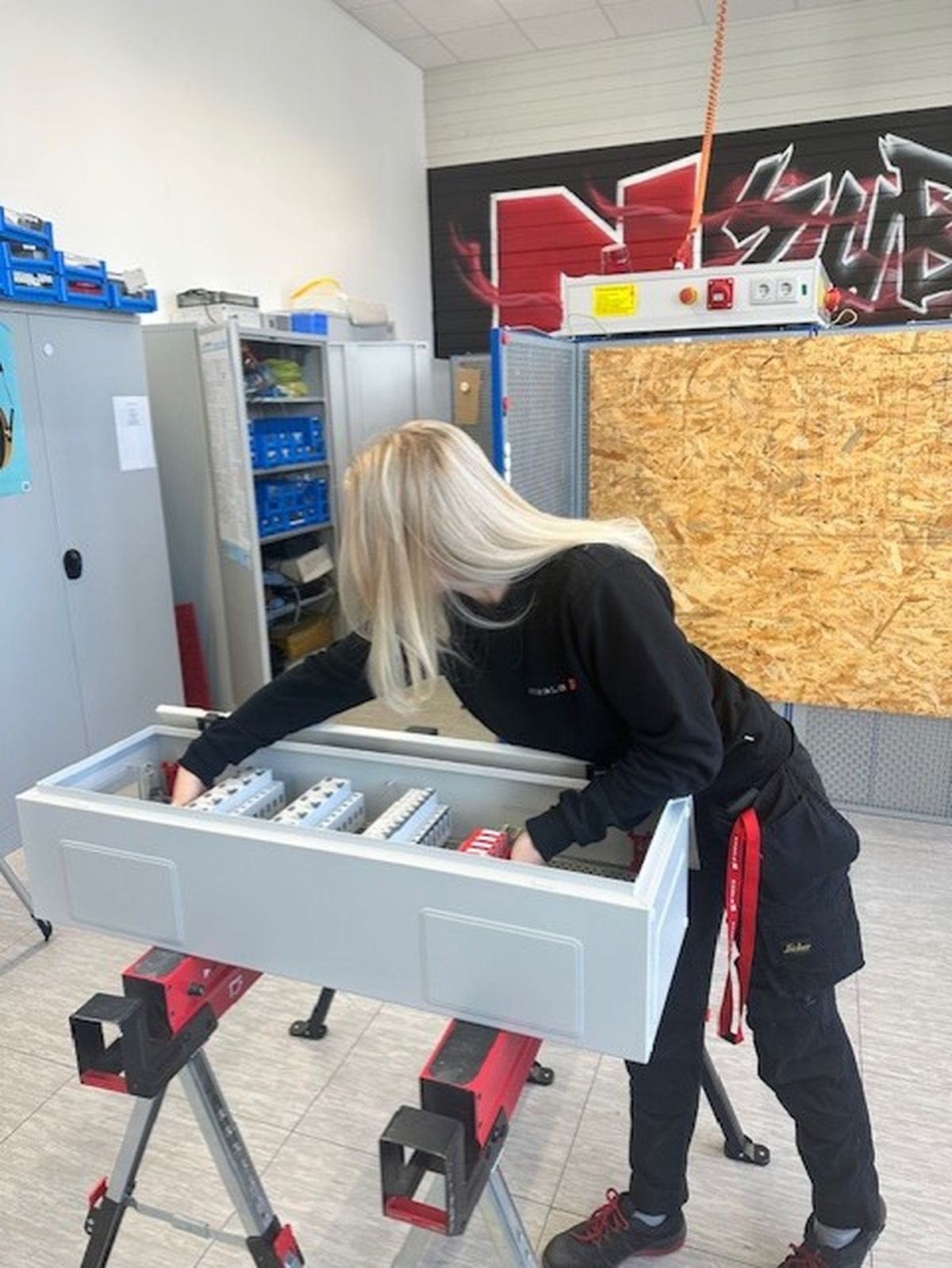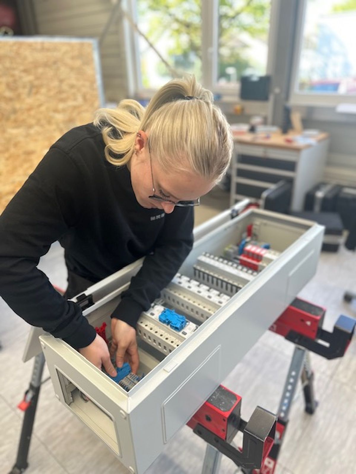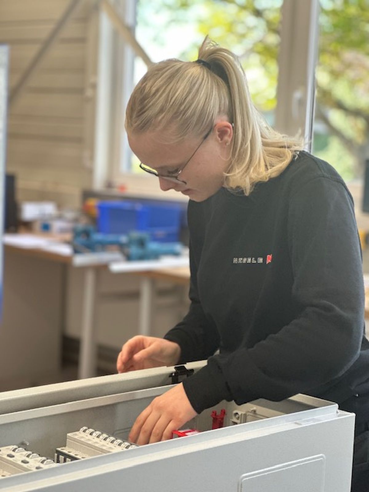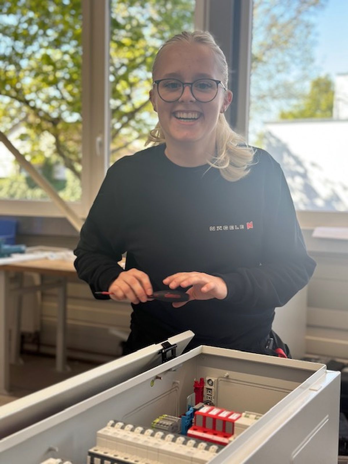 Mein Name ist Lenja Annina Urbschat, ich bin 19 Jahre alt und komme aus Denkendorf. Seit September 2025 lerne ich den Beruf Elektronikerin für Gebäudesystemintegration bei der Firma Nägele Stuttgart GmbH. Ich habe 2024 mein technisches Fachabitur gemacht und daraufhin in Konstanz mit einem Maschinenbau-Studium begonnen, jedoch schnell bemerkt, das ist nichts für mich. Jetzt stehe ich hier und bereue keine einzige Entscheidung. Warum? Weil ich meinen eigenen Weg gegangen bin. Was ich an meinem Beruf liebe: Verantwortung zu übernehmen, Leistung zu bringen und mich als Frau im Handwerk zu beweisen. Ich bin stark, selbstbewusst und herzlich, und auch wenn es mal hart wird, weiß ich was zu tun ist.